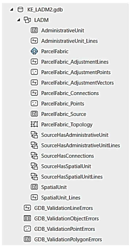 All the LADM classes, attributes, code lists, associations and multiplicities in the Kenyan profile are completely created in the desktop GIS software geodatabases as feature classes, fields, domains and relationship classes. To better manage the spatial unit, a feature dataset is created; this contains the associated topology rules and the parcel fabric. The conversion of the special attributes for the Kenyan LADM profile is performed without any problems. A complete data model for Kenya is now in the production state as presented in Figure 11, and the database can now be filled with data.