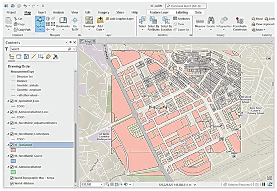 Deploy the Kenyan profile into a geographic information system (GIS) software system: the LADM profile for Kenya developed [1] is based on the Unified Modeling Language (UML) that is translated to any database management system (DBMS) preferred. The model is converted into a GIS system schema in GIS software. This step makes the model ready for implementation and use in the other steps as discussed in Section 8.2.