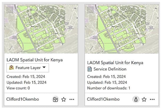 Using online GIS software as a web engine, the model and parcel data displayed in desktop GIS software are published as a feature service by sharing as a web layer. The map service can now be accessed through online GIS software content as a feature layer, accompanied by a service definition that stores the metadata for the service as displayed in Figure 14.