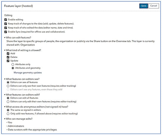 Once the service is well set in the online GIS software, setting to enable feature editing (add, update and delete), editor tracking and offline use was carried out as shown in Figure 15. This is to enable all field officers to edit all the features, both geometry and attributes, instantly and, if working offline, to then synchronise once back to where Internet is available.