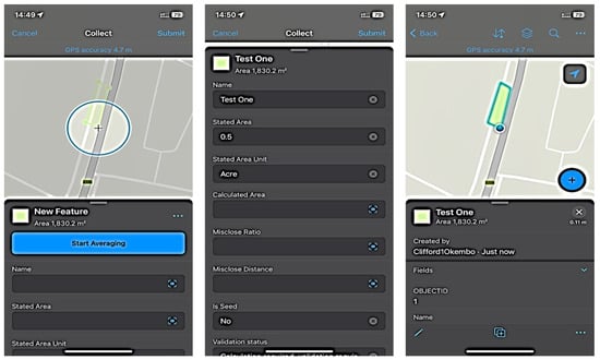 With them, the field team could map the parcel corners through point averaging, noting the accuracy required, which, for this exercise, was less than 5 m. The attribute information was also entered after the geometry was completed as in Figure 17.