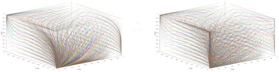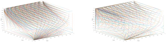 Furthermore, parameters that satisfy the above conditions are set, and except for government subsidies, all other parameters remain consistent with those listed in Table 3. This is to study the significance of government involvement in the green development of saline–alkali land. The specific parameter assignments are shown in Table 8, and phase diagrams are illustrated in Figure 2. On the left side of Figure 2, the phase diagram depicts the evolution of the tripartite game dynamic system without historical decision-making using the ODE algorithm. On the right side, the phase diagram incorporates historical decisions using the DDE algorithm, with a lag period of one year.