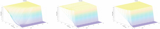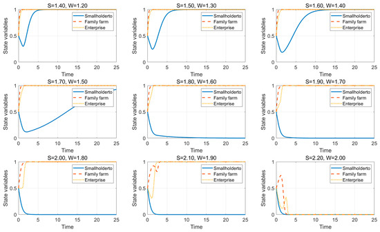 Holding other parameters constant, this study performed a sensitivity analysis on the initial willingness to participate for smallholders (S), family farms (F), and seed industry enterprises (E), which is depicted in Figure 3. The figure shows the variability of initial willingness along the x-axis (time), y-axis (initial willingness), and z-axis (state variables).