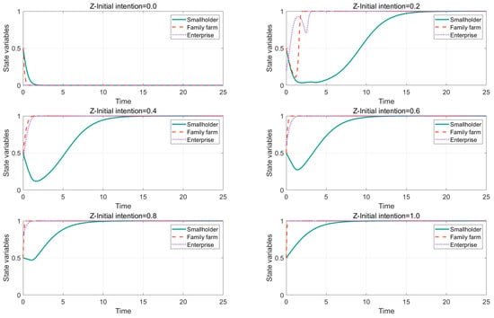To further investigate the significance of salt-tolerant crops for the green development of salinized lands within the tripartite evolutionary game system, this study, while keeping other parameters constant, fixed the initial participation willingness of smallholders and family farms at 0.5 and varied that of seed enterprises. Figure 4 illustrates these changes and suggests that when seed enterprises are unwilling to provide seeds for salt-tolerant crops (Z-Initial intention = 0), neither smallholders nor family farms are inclined to plant conventional crops on salinized land. However, once seed enterprises supply a certain amount of salt-tolerant seeds, both smallholders and family farms decide to adopt them after various decision-making intervals, with the time taken for this decision decreasing as the initial willingness of the seed enterprises to participate increases. This indicates that the supply of salt-tolerant seeds significantly influences the behavioral choices of smallholders and family farms. The reason is twofold: on the one hand, traditional perceptions and mindsets suggest a substantial risk of total crop failure when planting on salinized land without salt-tolerant seeds. When these seeds are offered, it increases the expected yield for cultivating salinized land. On the other hand, salt-tolerant crops generally have a rich nutritional value, such as the unique organic compound IP6 found in “sea rice,” which has cancer-prevention, anti-aging, and immune-regulatory effects, making it a highly beneficial health food. Consequently, there is a high market demand for salt-tolerant crops, enabling economic gain from their cultivation. Overall, salt-tolerant crops are key to the sustainable development of salinized lands, reducing operational risks for farmers, enhancing expected economic returns, and encouraging smallholders and family farms to develop salinized lands.