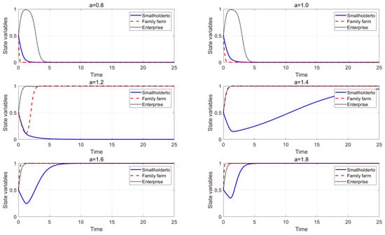 Upon examining Figure 2, it is evident that under the given parameters, the tripartite game dynamic system tends to converge more towards E7(0,1,1) and E8(1,1,1) after the inclusion of government subsidies, regardless of the consideration of historical decisions. This indicates that government involvement is crucial to the green development of saline–alkali land. Family farms and seed industry businesses show a stronger inclination to develop saline–alkali land, converging more towards a strategy of 1, while small-scale farmers do not consistently converge on this strategy. This suggests that, compared to family farms and seed industry businesses, small-scale farmers face greater challenges in adopting salt-tolerant crops. Possible reasons include government subsidies reducing the risks associated with green development for all parties, especially family farms and seed industry businesses, which have more resources and capabilities to absorb the high initial costs and better utilize the external support provided by the government. However, small-scale farmers lack sufficient operational scale to effectively use subsidies and achieve economies of scale. They also have a lower risk tolerance, making it difficult for them to face the uncertainties of developing saline–alkali land even with subsidies. Additionally, small-scale farmers are typically at a disadvantage in accessing information and technology for salt-tolerant crops. Lastly, they often lack the liquidity to undertake development efforts, even with government subsidies.