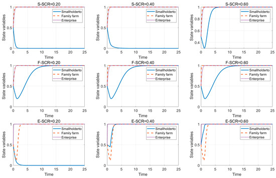 Lastly, this study conducted a sensitivity analysis on the subsidies received by various stakeholders in the tripartite evolutionary game system during the green development process of salinized lands, as illustrated in Figure 7. The sensitivity analyses for smallholders, family farms, and seed enterprises are represented in the first, second, and third rows, respectively. The government subsidies as a proportion of the costs borne by the stakeholders in developing salinized land are denoted by S−SCR = Mx2/(C1 + S ∗ L1); F−SCR = My2/(C2 + S ∗ L2); E−SCR = M3/(C3 + W ∗ (L1 + L2)).