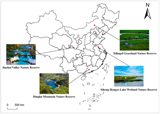 Four national nature reserves were initially chosen for empirical analysis, encompassing distinct ecosystem types that are representative of China’s major nature reserves: forests, grasslands and meadows, inland wetlands and aquatic ecosystems, and wildlife. Dinghu Mountain National Nature Reserve, situated in Zhaoqing City, Guangdong Province and covering approximately 1133 hectares, falls under the forest ecosystem category. Established in 1956, it is renowned among biologists as a “treasure trove of species” and a “gene repository”. Xilingol Grassland National Nature Reserve, the largest grassland-meadow type nature reserve in China, belongs to the grassland and meadow ecosystem type. Located in Xilinhot City, Inner Mongolia Autonomous Region, it spans about 580,000 hectares. Hongze Lake Wetland National Nature Reserve, occupying Sihong County, Jiangsu Province, covers around 49,365 hectares and belongs to the inland wetland and aquatic ecosystem type. It stands as the national nature reserve with the most well-preserved ecosystem in East China. Jiuzhai Valley National Nature Reserve, located in Jiuzhai Valley County, Sichuan Province, encompasses approximately 65,075 hectares and falls under the wildlife ecosystem type. Notably, it is China’s inaugural nature reserve, established primarily for the protection of natural scenery. The location of each reserve is shown in Figure 1.