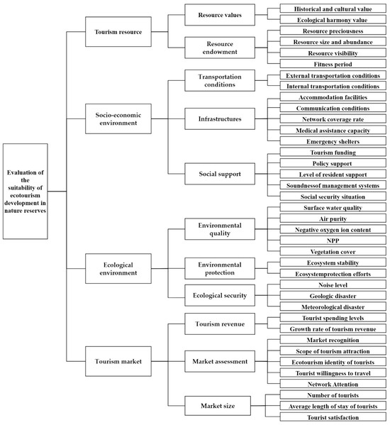 The concept of ecotourism was initially introduced by Lascuráin, a consultant to the IUCN in the 1980s, and has gained global acceptance over time. He defined ecotourism as “tourism in which the traveler enters a relatively pristine natural area to learn, appreciate, and enjoy the natural scenery, wildlife, and local culture, both ancient and modern” [1]. Assessing the suitability of ecotourism development is a crucial prerequisite for the effective protection and rational utilization of tourism resources. It provides a scientific foundation for determining the optimal mode and appropriate scale of ecotourism development. The Guiding Opinions on the Establishment of a Nature Reserve System with National Parks as the Main Body, officially issued by the General Office of the Central Committee of the Communist Party of China (CPC) and the General Office of the State Council in June 2019, explicitly outlines the creation of a new nature reserve categorization system. This system, with national parks as the focal point, nature reserves as the foundation, and various types of nature parks as supplements, underscores the pivotal role of nature reserves in the evolving protection system [2]. A nature reserve, as defined by law, designates a specific area of land, land waters, or sea areas for the special protection and management of representative natural ecosystems, concentrations of rare and endangered species of wildlife and plants, and significant natural relics [3]. With rich natural and human resources, nature reserves possess noteworthy scientific, educational, historical, cultural, and natural advantages for ecotourism development [4]. They serve as vital spaces for tourists to engage in leisure and recreational activities [5].