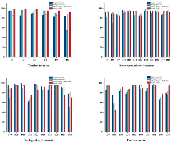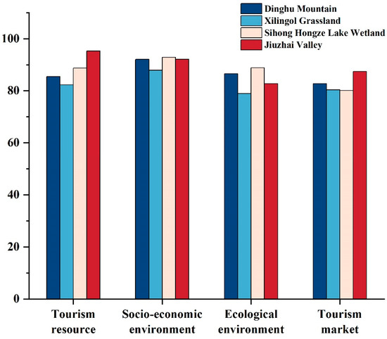 Scores for element-level indicators were computed based on the weights assigned in Table 1, and differences among the element-level indicators for each type of nature reserve were analyzed. Figure 4 illustrates that Jiuzhai Valley significantly outperforms others in terms of resource values, resource endowment, market assessment, and market size. This can be attributed to its rich history and culture, exceptional ecosystems safeguarding numerous rare species and their habitats, and its recognition as a UNESCO World Heritage Site since 1992. Jiuzhai Valley has earned acclaim as one of the world’s premier ecotourism destinations, making it a highly coveted destination for both Chinese and international tourists. The reserve boasts a strong allure and provides an enriching experience for visitors. On the contrary, Xilingol Grassland achieves notably lower scores in resource endowment, transportation conditions, infrastructures, and ecological security. This is attributed to its simpler and more fragile ecosystems, less-developed grassland roads, lower economic development, inadequate infrastructure, and anthropogenic activities that jeopardize ecological security. The tourism industry experienced a severe negative impact from the epidemic, resulting in generally low scores for tourism revenue across all nature reserves. Conversely, scores for social support, environmental quality, and environmental protection were relatively balanced. This indicates that the nature reserves not only possess favorable natural conditions for ecotourism development but also receive robust support from both the government and society.