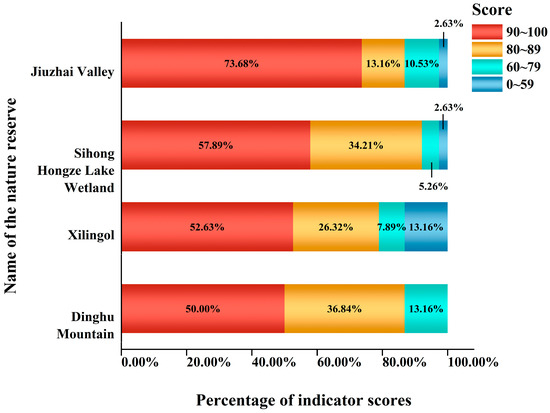 After scoring the indicators for evaluating the suitability of ecotourism development in each nature reserve, the ratio of the score interval for each indicator was calculated to delve further into the results of the evaluation across different types of nature reserves. A high percentage of high-scoring indicators will strongly increase the total score of the evaluation of the suitability of ecotourism development in nature reserves, while low-scoring indicators will lower its total score. The proportion of scores for the indicators shows the high and low total evaluation scores for each nature reserve and the reasons for the roughly equal scores. In Figure 6, Jiuzhai Valley boasts the highest proportion of indicators with scores ranging from 90 to 100, constituting 73.68% of all indicators. Following closely are Hongze Lake Wetland and Xilingol Grassland, with proportions of 57.89% and 52.63%, respectively. Dinghu Mountain, on the other hand, exhibits the lowest proportion of indicators with scores from 90 to 100, standing at only 50%. A substantial number of high-scoring indicators effectively contribute to an enhanced overall score for evaluating the suitability of ecotourism development, providing Jiuzhai Valley with a notable advantage in this regard.