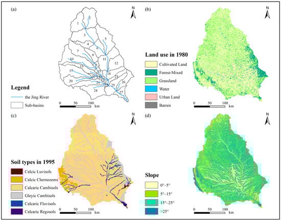 Classification of (a) sub-basins, (b) land use, (c) soil types, (d) slope in the Jing River catchment.