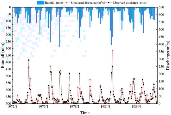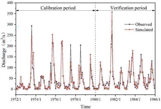 According to the comparison curve (Figure 3) and correlation relationship (Figure 4) between the simulated and observed monthly average discharge of the Zhangjiashan Hydrology Station during the calibration period (1972–1979) and the verification period (1980–1985), the simulated monthly discharge in these two periods was in close accordance with the observed discharge.