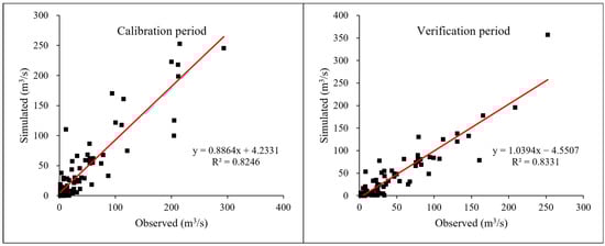 Correlation relationship between the simulated and observed monthly average discharge during the calibration and verification periods.