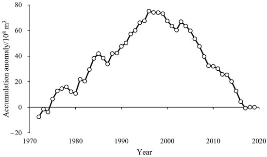 The cumulative anomaly method is a test method based on the mean value and is used to reflect the changing trends in the data []. If there is an evident increasing and decreasing trend around a certain time value of the curve, this point can be regarded as an abrupt point of the changing trend. For sequence X, the cumulative anomaly at time t is expressed by Equation (1):