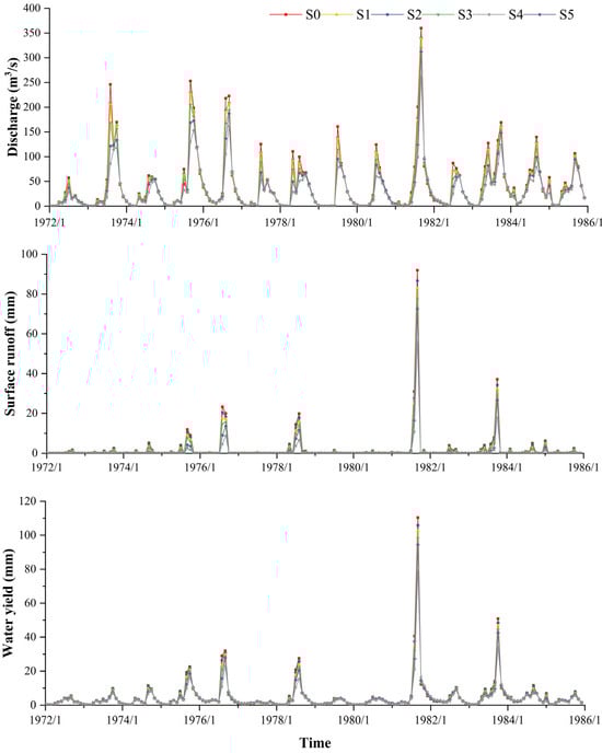 The effects of different SWCMs on the discharge, surface runoff, and water yield at the watershed outlet were quantitatively analysed through the simulations of S0, S1, S2, S3, S4, and S5 (Figure 6). Compared with the S0 scenario, the five SWCMs all reduced the discharge, surface runoff, and water yield. Among them, the reduction efficacy of building terraces on the 5–15° slope was slightly greater than that of building terraces on the 15–25° slope. The reduction efficacy of changing cultivated land to forest land was stronger than that of changing cultivated land to grassland. In general, the reduction intensity of the terracing measures on runoff was lower than that of the vegetation measures. Changing cultivated land to forest land had the most significant influence on overall hydrological processes. Moreover, they all reduced the flood peak. The degree of reduction in flood peaks by each measure was ordered as follows: returning farmland to forest > returning farmland to grass > building terraces on a 5–25° slope > building terraces on a 5–15° slope > building terraces on a 15–25° slope.
