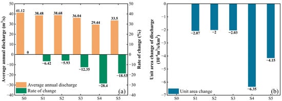 Analysis of the influence of SWCMs on the average annual discharge in the S1–S5 scenarios: (a) change rate of the average annual discharge, (b) unit area change of the average annual discharge.
