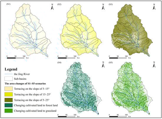 This study quantified the effects of different SWCMs on the discharge (Figure 7). Compared with the average annual discharge in the basin with no measures, building terraces on the 5–15°, 15–25°, and 5–25° slopes, changing cultivated land to forest land, and changing cultivated land to grassland reduced the discharge by 6.42, 5.93, 12.35, 28.40, and 18.53%, respectively (Figure 7a). Due to the various area settings of the five SWCM scenarios, it was not possible to directly compare their water reduction benefits on this basis. Therefore, it was necessary to generate statistics on the area changes of the SWCMs in the S1–S5 scenarios and analyse the impact of their unit area changes on runoff. According to the statistics of the area changes from the SWCMs in the S1–S5 scenarios (Figure 8), the area used for building terraces on the slope of 5–15° was 12,772.86 km2, or 29.52% of the whole basin area, the area for the 15–25° slope was 12,228.86 km2, or 28.26% of the whole basin area, and that for the slope of 5–25° was 255,001.72 km2, or 57.78% of the whole basin area; and the area used for cultivated land changed into forest land was 18,380.67 km2, or 42.48% of the whole basin area, and that for cultivated land changed into grassland was 18,380.67 km2, or 42.48% of the whole basin area. From the analysis of the influence of unit area changes of different SWCMs on the average annual discharge at the watershed outlet, building terraces could potentially reduce the discharge by approximately 2.07 × 10−4, 2.00 × 10−4, and 2.03 × 10−4 m3/s/km2 for the 5–15°, 15–25° and 5–25° slopes, respectively; changing cultivated land to forest land could potentially reduce the discharge by approximately 6.35 × 10−4 m3/s/km2, and changing cultivated land to grassland could reduce the discharge approximately 4.15 × 10−4 m3/s/km2 (Figure 7b).The reduction benefits of the five measures on the average annual discharge were ranked as follows: changing cultivated land to forest land > changing cultivated land to grassland > building terraces on a 5–15° slope > building terraces on a 5–25° slope > building terraces on a 15–25° slope.