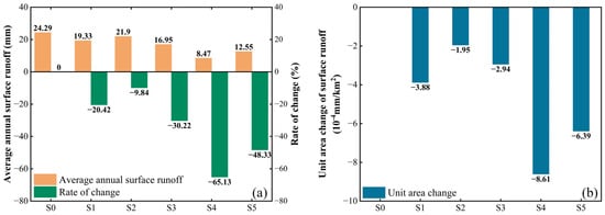 Analysis of the influence of SWCMs on the average annual surface runoff in the S1–S5 scenarios: (a) change rate of the average annual surface runoff, (b) unit area change of the average annual surface runoff.