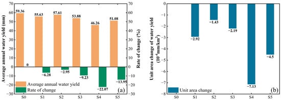 Analysis of the influence of SWCMs on the average annual water yield in the S1–S5 scenarios: (a) change rate of the average annual water yield, (b) unit area change of the average annual water yield.