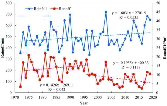Average annual rainfall and runoff in the Jing River catchment from 1972 to 2019.