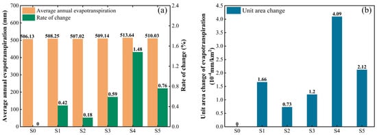 Analysis of the influence of SWCMs on the average annual evapotranspiration in the S1–S5 scenarios: (a) change rate of the average annual evapotranspiration, (b) unit area change of the average annual evapotranspiration.