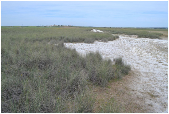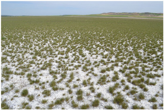 Figure 7. The formations of esparto grass (Lygeum spartum) known as “albardinares” are typical of the Iberian “steppes”, located in the highest area around El Hito saline pond that the waters leave untouched. These formations protect the soil from erosion and delay siltation within the pond.