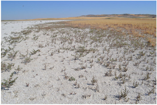 The dominant species of the vegetation are all salt-tolerant. Fortunately, there is detailed information on saline continental Mediterranean wetlands such as El Hito and their plant characteristics [15,17,18,19,20,21]. Figure 2 and Figure 3 show photographs of various halophilic plant communities colonizing El Hito Pond.
