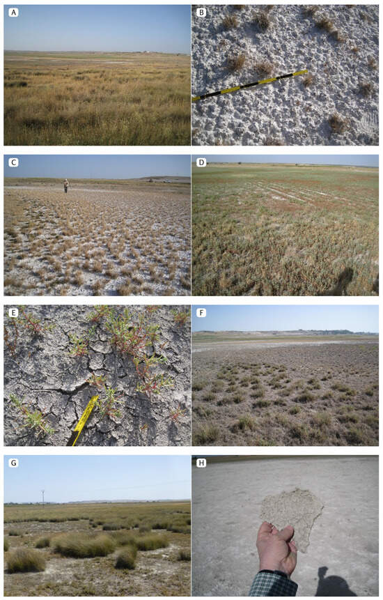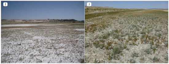 Figure 4. Criteria for sampling: (A) grassland interspersed with formations of Lygeum spartum, Puccinellia festuciformis, and Elymus curvifolius; (B) bare soil with dry remnants of formations of Puccinellia festuciformis; (C) Puccinellia festuciformis; (D) Salsola soda, Hordeum marinum, and Puccinellia festuciformis; (E) shrinkage cracks with a few examples of Salsola soda; (F) grassland of Puccinellia festuciformis and annual plants of nitrified soils; (G) Lygeum spartum formations; (H) saline crust in bare soil; (I) sparse grassland of Salicornia ramossisima; (J) grassland with Salsola soda and Salicornia ramosissima.