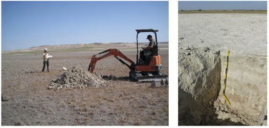 Soil selection for sampling was dependent on certain soil-related features, such as drainage, presence or absence of salt crust at the soil surface, and especially vegetation type and density (Figure 4). For example, during sampling, the epsomite efflorescences appeared in the form of fibrous or hairlike acicular crust, while the structure of the hexahydrite efflorescences tended to be columnar. The soil profiles were described and sampled, having previously been opened up with a backhoe machine (Figure 5). Both the soil profiles and the surface sampling points were geo-referenced using Global Positioning System (GPS) coordinates. Probably, the most striking visual expressions of salinity at El Hito are, on one hand, the efflorescence on the soil surface (in dry periods) and, on the other, the halophilous vegetation (Figure 4). The samples were bagged, properly labelled, and transported to the laboratory for analysis. In total, 49 final soil samples were collected, consisting of 18 from several soil profiles and 31 from surface soil horizons.