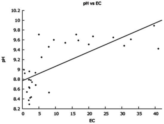The graph in Figure 6 below represents the linear relationship between soil pH and soil EC for the depth of 0–10 cm. Visual observation and statistical analyses indicated that the soil pH had a significant positive relationship with the soil EC (pH = 5.403–0.152 EC). The correlation coefficient was −0.88.