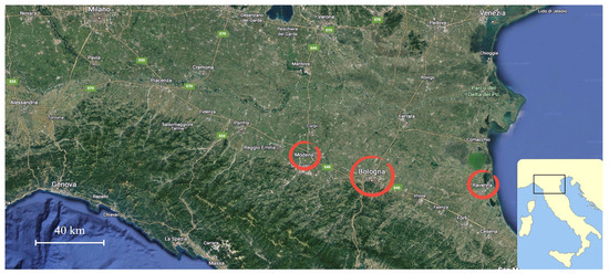 Location of the three case studies in the Po Valley, Emilia-Romagna, northern Italy: Modena, Bologna, Ravenna. Elaboration of the author from Google Maps.