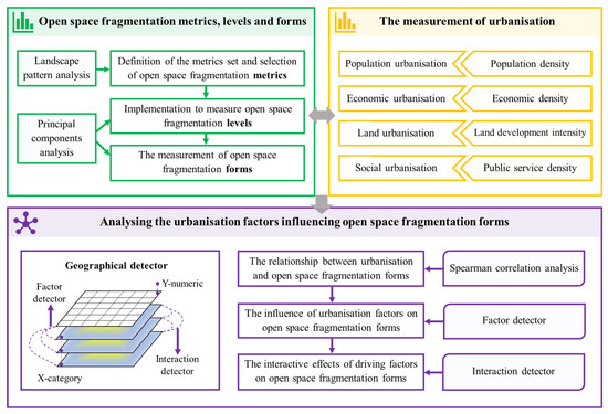 The overall methodological framework (Figure 2) consists of three main components: assessment of open space fragmentation forms, measurement of urbanisation, and the interactive effects of urbanisation on open space fragmentation. The key steps are as follows: First, we assessed open space fragmentation forms utilising landscape pattern analysis and principal components analysis. Second, we quantified population, economic, land, and social urbanisation through population density, economic density, land development intensity, and service facility density. Lastly, we further investigated the relation between open space fragmentation forms and urbanisation by means of the factor and interaction modules of the geographical detector model.