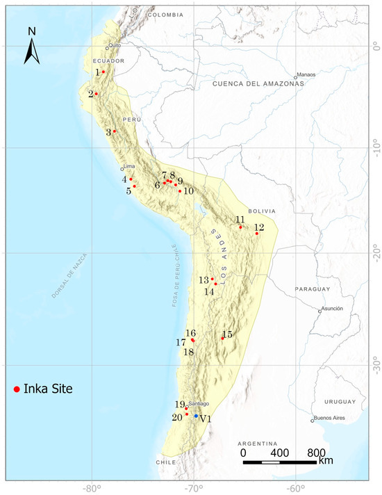 Map of selected sites. Map of the Andes Mountain Range in South America, indicating the extent of Tawantinsuyu in yellow. Red circles indicate the location of the selected Inka sites. 1. Ingapirca; 2. Aypate; 3. Pariachuco; 4. Incahuasi; 5. Tambo Colorado; 6. Choquequirao; 7. Machu Picchu; 8. Ollantaytambo; 9. Tipón; 10. Raqchi; 11. Incallajta; 12. Samaipata; 13. Caspana; 14. Licancabur; 15. Shincal; 16. Punta Brava; 17. P. Incaico de la Puerta; 18. Viña del Cerro; 19. Huaca de Chena; 20. Cerro Grande de la Compañía. Blue circle indicates the location of the selected unexplored site for verification: V1. Volcán Maipo.
