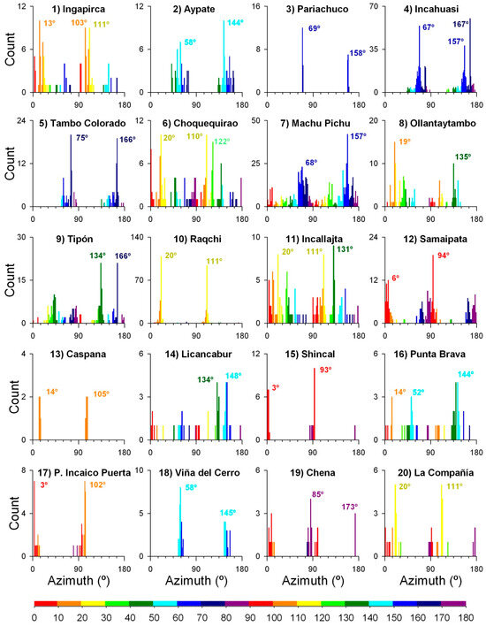 Frequency analysis of Inka wall orientation. Histograms from wall azimuths calculated for each Inka site. Numbers in degrees denote preferential azimuths. A color palette was designated for intervals of 10°, ranging from 0° to 90°, and replicated for 90° to 180°.