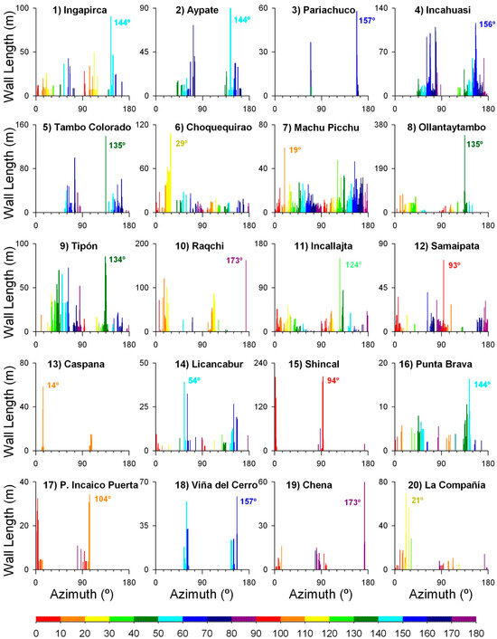 Distribution of Inka wall lengths. Bar graphs show the distribution of wall lengths by azimuths obtained for each Inka site. The azimuth of the longest wall is indicated with numbers in degrees. A color palette was designated for intervals of 10°, ranging from 0° to 90°, and replicated for 90° to 180°.