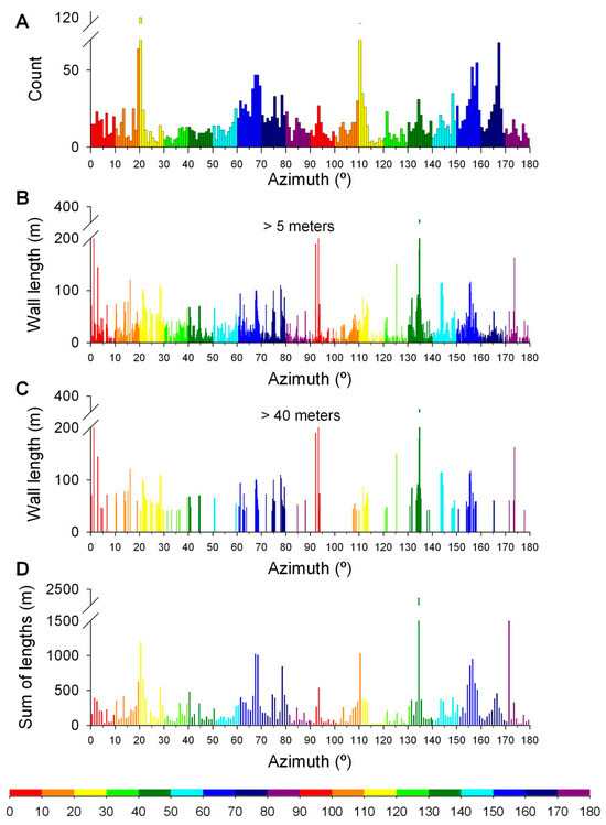 Integrated analysis of all Inka walls for all twenty sites. (A) Histograms of wall count vs. azimuths. (B,C) Bar graphs show the distribution of wall lengths above 5 m (B) and 40 m (C). (D) Bar graphs of the sum of all wall lengths grouped by azimuth from all twenty sites. A color palette was designated for intervals of 10°, ranging from 0° to 90°, and replicated for 90° to 180°.