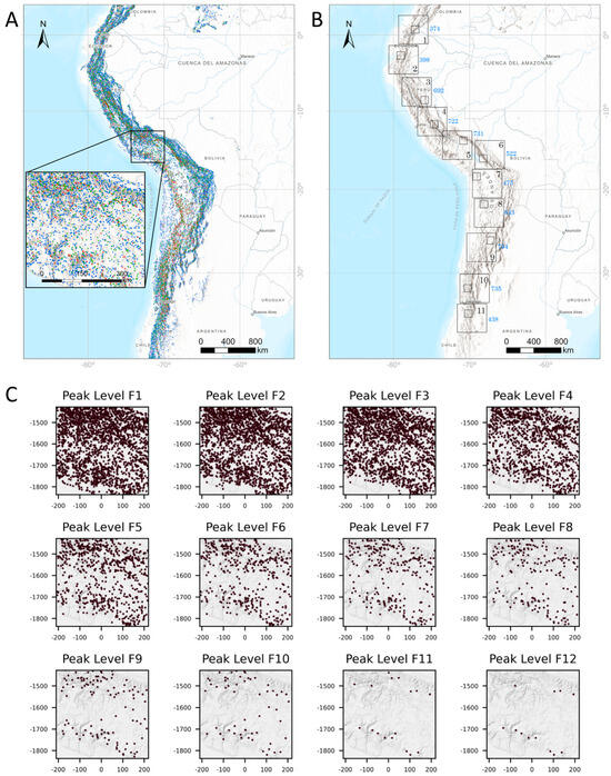 Map of detected mountain peaks and geographical zones of study. (A) Detected peaks are shown in blue, green, and red dots representing filtering values of levels F1, F5, and F8, respectively. The inset displays an area approximate to area #5 Cusco shown in B. (B) Areas of analysis are indicated by squares and numbered from 1 to 11. The total number of peaks per zone filtered at F5 is indicated in blue. Each area includes a smaller sub-area of study. (C) Detected mountain peaks on same area shown on inset in A at different peak filtering levels from F1–F12. Graticule numbers are in km. Peak Level 13 is not shown because, in this selected area, only one peak is left. Peak levels (1–3) are categorized as local, merely prominent; (4–10) as regional, dominant and prominent; and (11–13) global, remarkably dominant over the others. The positional resolution of these peaks is set at 250 m, consistent with that of the GMTED DEM, in the Cassini map projection.