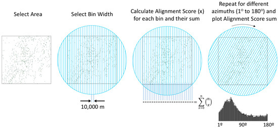 A total of 20,794 (F1), 6494 (F5), and 1524 (F8) mountain peaks were included in these areas of analysis (Figure 6 and Table 2). Then, for each of these areas, mountain peaks were analyzed with our own peak-alignment algorithm to determine an alignment score for each azimuth degree and estimate the pattern orientation of the geomorphology (Figure 7). We implemented an alignment algorithm beginning with the calculation of a “circular bounding box”, a technique adapted from Ritter [44], to encompass all relevant data points within a defined two-dimensional space. This bounding circle set the stage for further segmentation along the x-axis, in which, we divided the space into “bins” or sectors, aiding in the systematic categorization of the spatial data.