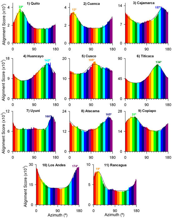 Considering the count frequency, preferential orientations, and longest wall azimuth, the most representative azimuths found in Inka architecture (±1°) were 4°, 14°, 20°, 29°, 41°, 68°, 78°, 93°, 111°, 122°, 135°, 144°, 156°, 166°, and 174° (Figure 5). On the other hand, the prominent geomorphological axes in the Andes obtained from the regional peak-alignment score on different geographical areas (±1°) were 14°, 20°, 31°, 105°, 134°, 142°, 157°, 166°, and 174° (Figure 8). In addition to these peak-alignment orientations from large areas, the sub-areas displayed additional azimuths at 4°, 46°, 95°, 112°, and 121° (Figure S6).