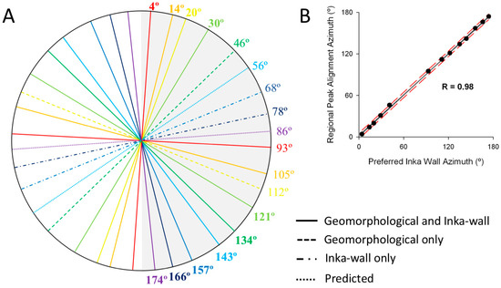 Radial distribution of preferred Inka wall and regional peak-alignment azimuths. (A) Representation of all prominent geomorphological peak alignments and preferred Inka wall azimuths (±1°) on a polar graph. Colors were designated for each azimuth within a 10° range from 0° to 90°, and replicated for 90° to 180°. Colored numbers show the specific azimuth for each preferred Inka wall and/or regional peak-alignment orientation. Grey half of the chart highlights the 0° to 180° range. (B) Correlation analysis between regional peak alignments and preferred Inka wall azimuth. Correlation coefficient (R); 95% confidence band (red).