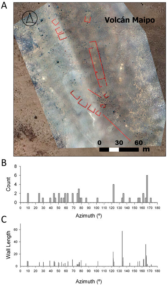 Wall azimuth analysis of possible Inka shrine at Maipo Volcano. (A) a map of the Volcán Maipo archaeological site and its analyzed walls in red. (B) count histogram for wall azimuth from A. (C) distribution of wall lengths with respect to their azimuth from A.