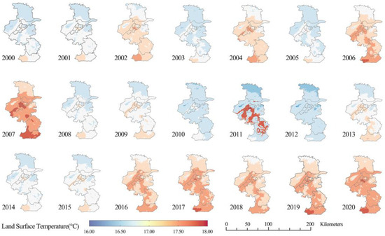 Spatiotemporal variation characteristics of the annual mean land surface temperature at 1 km resolution in Nanjing from 2000 to 2020.