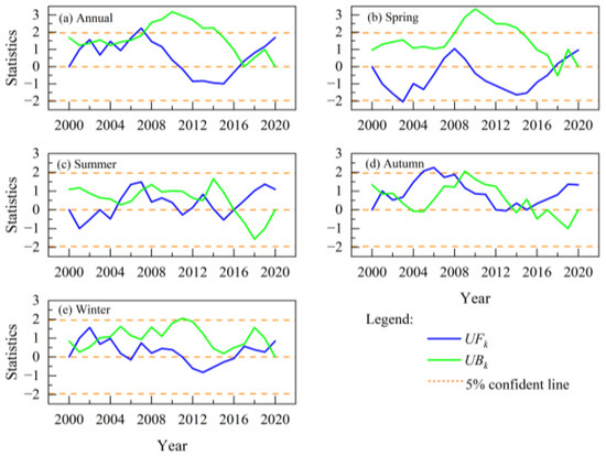 The temporal trend analysis of AMLST and seasonal mean LST (SMLST) was conducted by using the M-K test at the significance level of 95% (p ≤ 0.05). As depicted in Figure 3a, the UF value [59,60] in 2007 exceeded the confidence line (±1.96) and was greater than 0, indicating a significant rise in AMLST during that year. The UF values of other years exhibited either positive or negative, and their absolute values were both lower than 1.96, suggesting that there were insignificant upward or downward trends in the corresponding AMLST during those years.