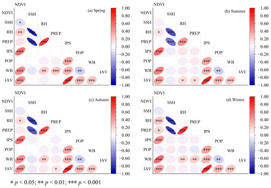 To provide variables for MGAMI modeling, the Pearson correlation coefficient was calculated using Equation (2) in Origin software, version 9.8.0. The results presented in Figure 4 revealed that RH, PREP, and SSH exhibited a significant correlation. Specifically, a positive correlation between RH and PREP was observed, while a negative correlation was found between SSH and both PREP and RH. The Pearson correlation coefficient between RH and SSH exhibited the highest values during spring (−0.87) and winter (−0.78), indicating a strong linear relationship between them; the lowest Pearson correlation coefficient was observed in summer (−0.67), suggesting a moderate linear relationship. The correlation between PREP and SSH exhibited a similar changing pattern. The correlation between PREP and RH exhibited seasonal variations, with the highest Pearson correlation coefficient observed in spring (0.77) and winter (0.78), while the lowest was found in summer (0.42). The Pearson correlation coefficient between IPS and IAV in summer was 0.81, which was positive and strong, and the correlation was significant.