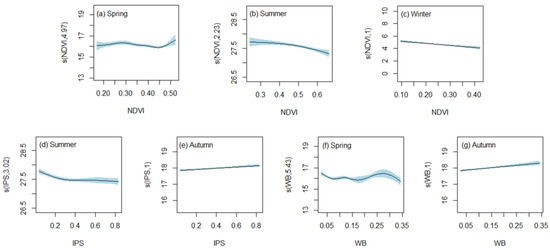 The importance and explanatory ability (IEA) of each explanatory variable to the response variable can be quantified by GAMs through the value of the F-test statistic. As illustrated in Table 2, the IEA of each explanatory variable varied with seasons. In spring, the IEA of SSH was strongest, followed by RH, PREP, WB, and NDVI. Compared with other seasonal models, the summer model had a larger DE and adj-R2 and possessed the best ability to describe changes in LST. The order of decreasing IEA was SSH, RH, NDVI, PREP, and IPS. The autumn model was better than the spring model at describing the change pattern of LST. The factor with the highest IEA in the autumn model was WB, while RH had the lowest IEA. In winter, SSH made the greatest contribution, followed by NDVI, whereas RH and PREP made relatively minor contributions.