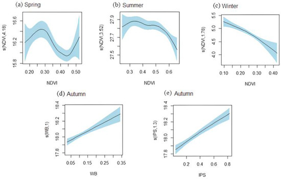 The estimated effects (ESTE) of the explanatory variables on LST with 95% confidence bands: (a) The ESTE of NDVI in spring; (b) The ESTE of NDVI in summer; (c) The ESTE of NDVI in winter; (d) The ESTE of WB in autumn; (e) The ESTE of IPS in autumn. The shade represents the confidence interval, while the solid line represents the smooth fitting curve. The numbers in parentheses on the ordinate indicate the estimated degrees of freedom.