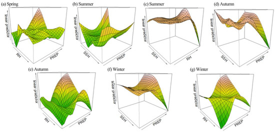The estimated effects of the interactive terms are illustrated in Figure 7. As shown in the figure, the X and Y axes represent two variables with significant interaction, respectively. The Z-axis represents the estimated LST corresponding to the interaction between the variables. The arrow indicates the direction in which the value increases. Due to the significant variations in SSH, RH, and PREP across different seasons, the influence pattern of the interactions between the same two IFs exhibited seasonal disparities. For example, the impact of the interaction between RH and PREP varied between spring, autumn, and winter models. In addition, the significant IFs varied across seasons. In spring, the changes in LST were primarily influenced by the interaction between RH and PREP, in addition to the impact of NDVI. The significantly interactive factors observed during the summer period encompassed SSH-PREP and SSH-RH. The significantly interactive factors in autumn and winter remained consistent, encompassing both SSH-PREP and RH-PREP. It was worth noting that the influence of the interaction in the four seasons was all nonlinear. Additionally, it seemed easier to understand the variation pattern of LST after considering the effect of the interaction terms. For instance, Figure 7a illustrates that in the spring model, when PREP was almost at its minimum, and RH was almost at 62.94%, the estimated LST corresponding to the interaction between RH and PREP almost reached its lowest point. In the autumn model, Figure 7e demonstrates that when both PREP and RH reached their maximum values, the estimated LST of the interaction between RH and PREP almost also reached its minimum value. The reason may be that high precipitation can lead to an increase in relative humidity, which often results in the formation of clouds [61]. Clouds have the ability to reflect and scatter solar radiation, thereby reducing the amount of solar radiation reaching the ground and consequently lowering LST. Similarly, Figure 7g showed that in the winter model, when PREP reached its minimum, and RH reached its maximum, the interaction between RH and PREP resulted in the smallest estimated LST. For a similar reason, high relative humidity eventually reduces the amount of solar radiation reaching the surface, resulting in lower surface temperatures. Additionally, the interaction between SSH and PREP exhibited a similar impact on LST in the autumn model (Figure 7f) and the winter model (Figure 7d), except for the summer model presented in Figure 7b.