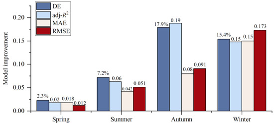 The model accuracy is found to be enhanced by taking into account the interaction between IFs, as evidenced by our experimental findings. The comparison of Table 2 and Table 3 reveals that DE and adj-R2 of different MGAMI-based seasonal models have been increased to some extent, indicating that the models based on MGAMI could better describe the changes in LST. As depicted in Figure 8, the autumn model exhibited the most significant improvement, with an increase of 17.9% and 0.19 for DE and adj-R2, respectively. Followed by the winter model, DE and adj-R2 improved by 15.4% and 0.15. The spring model showed the least improvement, with DE and adj-R2 increasing by 2.3% and 0.02, respectively. Furthermore, the root mean square error (RMSE) and mean absolute error (MAE) of the difference between LST and the fitted value have also been improved to varying degrees. The improvement was most significant in winter, followed by autumn, summer, and spring. Compared with MGAM, RMSE, and MAE of MGAMI decreased by 0.173 °C and 0.150 °C, respectively, in winter and decreased by 0.012 °C and 0.018 °C, respectively, in spring.