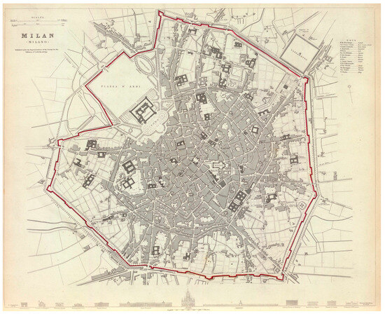 The urban environment, characterized by its complex landforms shaped by human activities, incorporates urban geoheritage, representing specific landforms enriched with historical and cultural significance. Urban geoheritage holds cultural significance due to its ability to reflect the historical development of human settlements and their interaction with the natural environment [5,6]. Urban geoheritage sites can be integrated into cultural heritage preservation efforts, contributing to the overall cultural landscape of a city. Therefore, recognizing the cultural dimension of urban geoheritage is essential for understanding its full significance within urban environments [5,7,8]. The inclusion of urban geoheritage in some urban geomorphological studies [9] and the development of methodologies [10] for its study have not been performed in many cases. Urban geomorphology should incorporate an urban geoheritage assessment to systematically evaluate and protect the cultural and natural assets represented by urban landforms and features shaped by natural processes within cities. Geoheritage is the term for the valuable geological and geomorphological components of the landscape that should be preserved [1,7,11,12,13,14,15]. Urban geoheritage refers to the collection of distinctive geological features, ongoing geological processes, and elements of the geological environment within urban areas and their immediate surroundings. These elements hold significance for contemporary society due to their scientific, cultural, and touristic value [7,11,16,17,18,19]. Detailed cartographic representations are fundamental tools for identifying, documenting, and managing the significant features of urban geomorphological heritage. For instance, Figure 1 displays a map of Milan in 1832, serving as a valuable historical document illustrating the layout of the city during that time period.