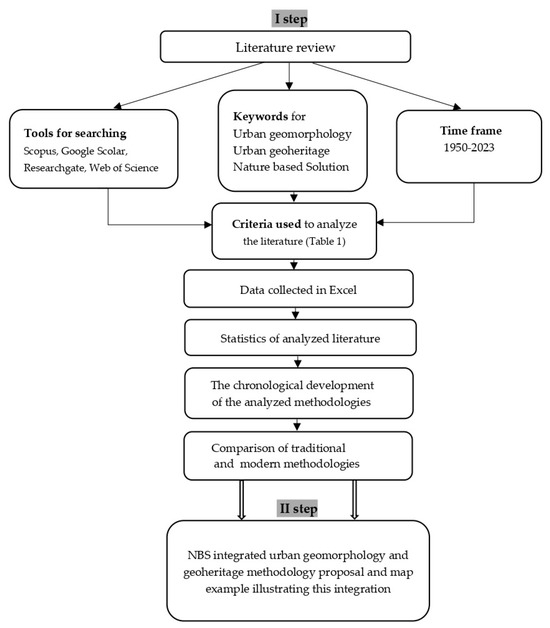 Flowchart indicates the methodology used for analyzing urban geomorphology, urban geoheritage, and an NbS methodology during 1950–2023. The criteria used for analyzing literature are listed in Table 1. We proposed an NbS-integrated methodology and tested its implementation.